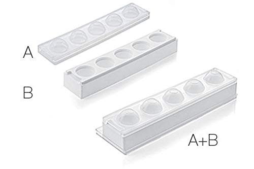 Lo stampo in silicone che permette di creare dei dessert al piatto o delle eleganti monoporzioni, a forma di uovo. Lo stampo è costituito da due parti: la base - parte B - in silicone bianco, e la copertura - parte A - di colore trasparente, quest'ultima voluta appositamente per permettere il riconoscimento del contenuto nella fase di riempimento. Dimensioni: Ø50 x 73 mm