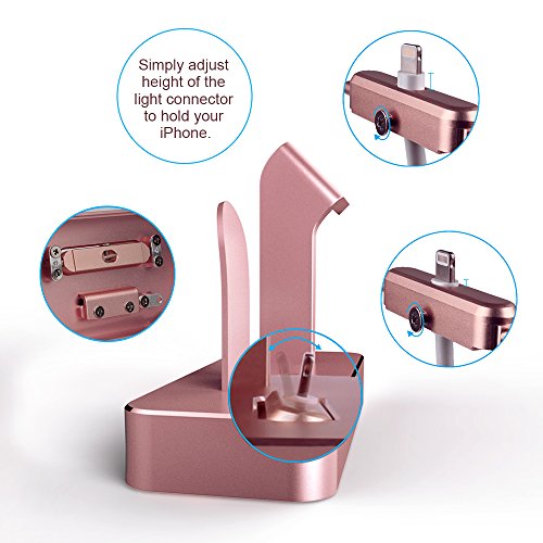 Stand Apple Watch Supporto iPhone Incluso Cavo Ricarica 8 Pin Lightning per Ricarica iPhone 2 in 1 Dock Station per Apple Watch & iPhone di Alta Qualità Supporto in Alluminio Resistente Bello Esteticamente Risparmiandoci Intralcio dei Cavi per Apple Watch 38mm/ 42mm/iPhone (5/ 5S/ 6/ 6s/6s Plus), Oro-Rosso