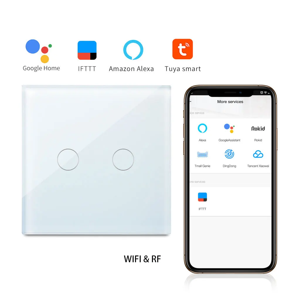 EU Standard 2 Gang 1 Way Wifi Switch Crystal Glass Panel Touch Switch Light Switch Smart Wall Switch Work With Tuya Google Alexa