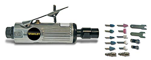 Smerigliatrice diritta ad aria compressa con 2 attacchi rapidi per collegamento al compressore, 2 mandrini per accessori con gambo diametro 3 mm e 6 mm, 5 molette gambo 3 mm, 5 molette gambo 6 mm e 2 chiavi di bloccaggio