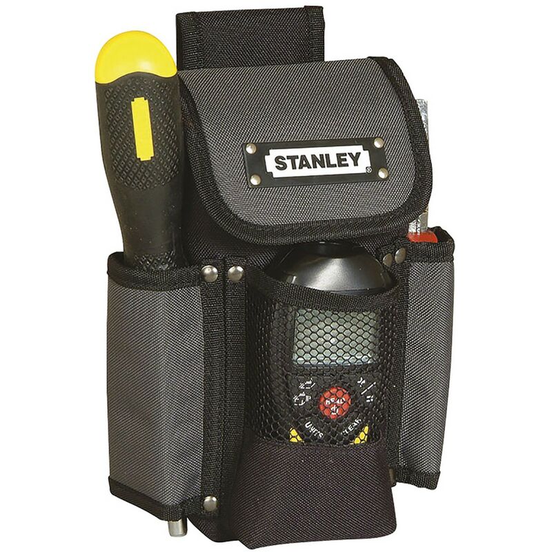 In nylon, con 1 tasca frontale con rete, 2 fascette laterali. chiusura superiore in velcro, agganciabile alla cintura.4 scomparti - cm 16 x 24 x 11