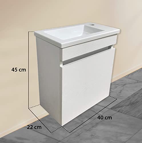 DIMENSIONE IDEALE: Questo set di mobili da bagno con lavabo ha la dimensione ideale per adattarsi allo spazio del vostro bagno. Dimensioni del prodotto: 40 x 22 x 45 cm (L x P x A) mobile da bagno sospeso e 40 x 22 cm (L x P x A) lavabo in plastica ABS bianca.