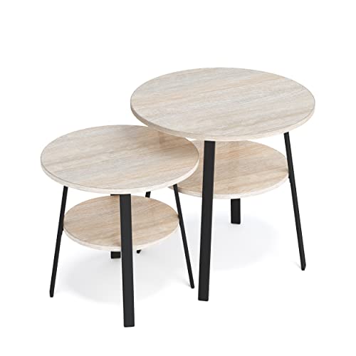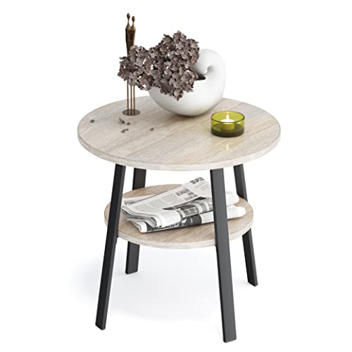 Stardis Tavolino rotondo stabile in metallo/legno, diametro 43 x altezza 44 cm, 2 ripiani, comodino per soggiorno, camera da letto, effetto rovere