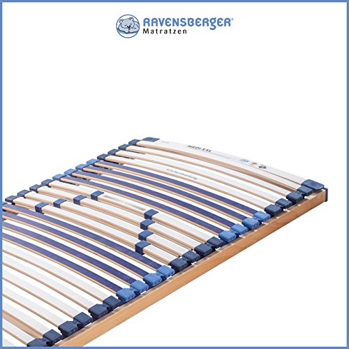 Le doghe in legno di faggio da 5 cm offrono un'elevata stabilità. Larghezza delle doghe: 3,5 cm. Distanza tra una doga e l'altra: 28 mm. Supporti in caucciù resistente con elevato spazio di sospensione. Le doghe sono larghe dalla testa ai piedi. Altezza del telaio: 8,5 cm. Capacità di carico: fino a 140 kg.