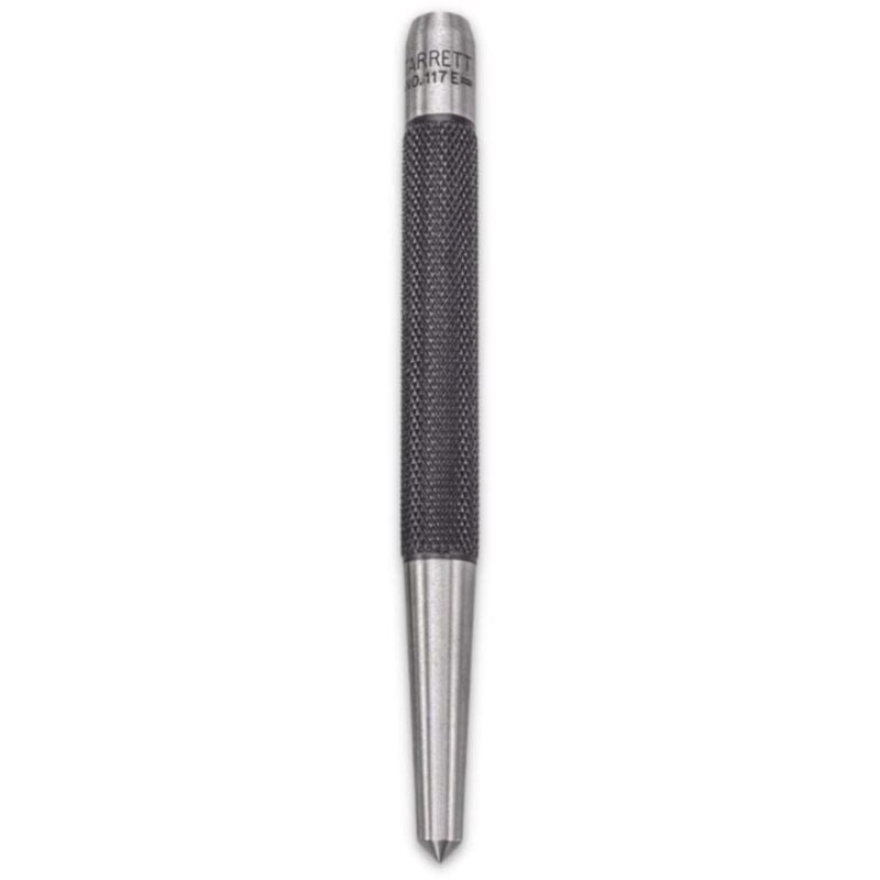 Il punzone centrale Starrett 117E con gambo rotondo è lungo 12,7 cm e ha una punta conica di 6,5 mm di diametro. Il punzone è realizzato in acciaio temprato e temperato, che fornisce resistenza all'usura e resistenza. Il gambo rotondo è zigrinato per la presa. I punzoni centrali fanno piccoli segni di fossetta in un pezzo in lavorazione per aiutare a guidare una punta da trapano. I punzoni centrali manuali hanno un gambo metallico con una punta e sono tipicamente maschiati con un martello a penna a sfera per contrassegnare il materiale. Le punzonatrici centrali automatiche hanno un meccanismo a molla interno che consente loro di contrassegnare il materiale senza usare un martello, lasciando una mano libera per fissare il lavoro. L'indirizzo del L.S. Starrett Company produce strumenti di misurazione di precisione, apparecchiature di metrologia e collaudo e prodotti per lame. L'azienda, fondata nel 1880, ha sede ad Athol, MA.