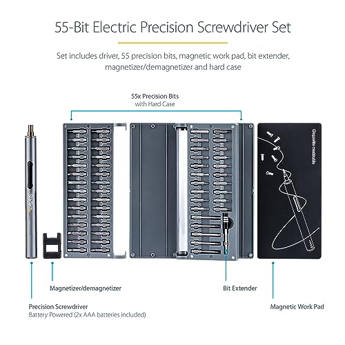 StarTech.com Set di cacciaviti elettrici di precisione 55 punte, Kit di cacciaviti a batteria portatile/mini per riparazioni di elettronica, magnetico, senza filo (CTK20PCEDRIVE)