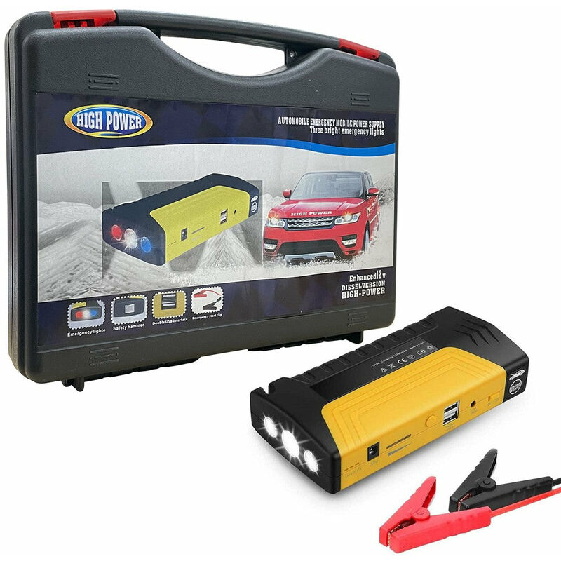 Jump Starter Jump Starter per Auto 300A 15000mAh Kit Emergenza Cavi Torcia Power Bank Grazie a questo piccolo ma potente jump starter potrai essere ben preparato per risolvere qualsiasi problema o imprevisto che possa accadere: grazie ai cavi con pinze da 300A ed una potenza di 15000mAh, potrà facilmente fare da avviatore al motore della tua automobile, furgone, moto, tosaerba, telefoni cellulari, tablet, e altri dispositivi su ciascuna delle due porte USB. Potrai ricaricare completamente questo jump starter in 5 ore con l'apposito caricabatterie. Dotata di torcia led con luci stroboscobiche ed SOS, potrà fornirti illuminazione e sicurezza in molte situazioni di pericolo o necessità, inoltre presenta anche un taglierino ed un martello integrato. Grazie alla sua valigetta potrai tenere in ordine il kit in poco spazio e trasportarlo con estrema facilità durante i tuoi viaggi ed escursioni. Caratteristiche Tecniche Jump Starter 12V per Auto Avviatore per motori Dimensioni: 17x8.5x3 cm