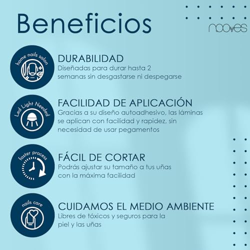 Risultati professionali a casa: Ottieni una finitura professionale e duratura con le nostre pellicole per unghie in gel NOOVES in pochi minuti. Risparmia tempo e denaro senza compromettere la qualità, dimentica gli smalti semipermanenti per unghie, le unghie finte, il polygel per unghie e i semplici adesivi per unghie