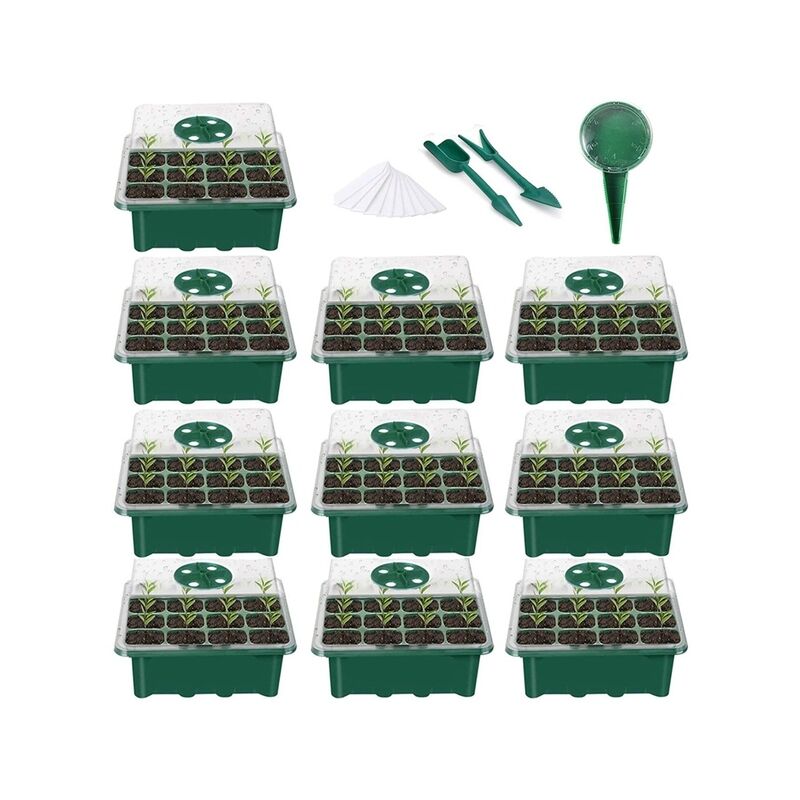 Total Control - Adjustable vents on the seed tray allow you to adjust the temperature and humidity of the hatching environment, so you have complete control over the germination process.[Clear Tray]Our germination grow tray set is made of high quality clear and durable plastic, this seed tray allows you to easily observe your plants without disturbing your process.[Perfect Choice for Heat Pad]: This seedling tray has excellent high and low temperature resistance, enough to use on the heat pad without worrying about melting.[Perfect Size for Large Seeds]: Square shape makes these seed trays suitable for large seeds such as potatoes, tomatoes, peppers, eggplants, etc.Material:plasticcolour:GreenPackage Contents:10 x nursery pots10 x Plant Labels2 x Small Garden Tools1 x Sowing Seeds DispenserOnly the above package content, other products are not included.Note: Light shooting and different displays may cause the color of the item in the picture a little different from the real thing. The