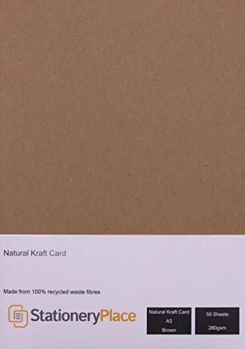 Stationery Place Thick - Brown Recycled Natural Kraft Card - A5 280 GSM 50 Sheet Pack