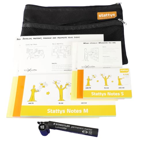 The Stattys Notes Starter Set 1 contains: one Stattys Notes Pad size „S“ and „M“ and the colours green, yellow and orange. It also contains a permanent marker in black and a Stattys-Bag for the best transport of our Notes.