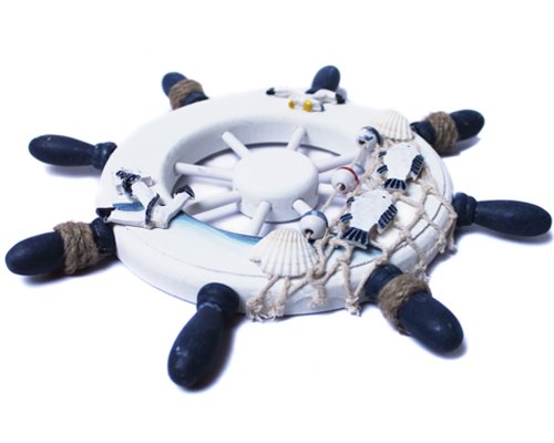 YUDU 01 - Statuetta Decorativa a Forma di timone in Legno con Rete da Pesca, Pesci e Conchiglie