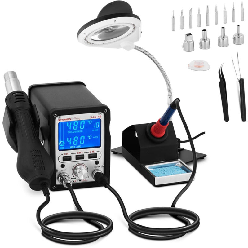 Set stazione saldante e dissaldante digitale - 70 W - Tasti salvataggio + accessori + lampada ingrandente di marca Stamos Soldering ✅ Modello: S-LS-45 S ✅ Articolo: 10021073 ⬇️ Caratteristiche principali Dispositivo 2 in 1 versatile con lampada d'ingrandimento e accessori Saldatoio potente e sostituibile da 70 Watt fino a 480 °C Efficiente saldatoio ad aria calda da 650 Watt fino a 480 °C con funzione automatica Tre memorie per salvare le impostazioni di lavoro preferite Stazione di base chiara e di facile utilizzo grazie al display LCD ⬇️ Dettagli tecnici Lente ⌀ 90mm Memoria 3 Flusso d'aria: [l/min] 120 Dimensione supporto [cm] 12,5 x 20 Corrente nominale in entrata [A] 6 Ingrandimento 5x / 10x Temperatura di stoccaggio [°C] -20 - 80 Stabilita della temperatura [°C] ±1 Intervallo temperatura di lavoro [°C] 0 - 40 Pistone aria calda - Intervallo di temperatura [°C] 100 - 480 Intervvallo di temperatura del saldatoio [°C] 200 - 480 Umidita relativa di lavoro e conservazione [%]