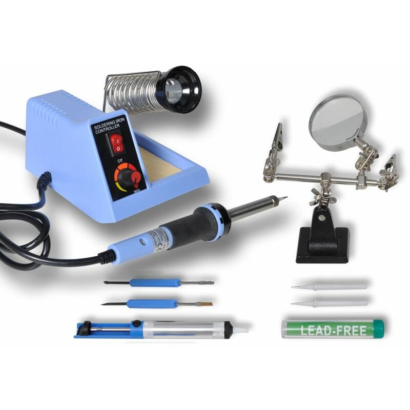 Guida al servizio post-vendita: https://drive.google.com/file/d/1mtcm-6CrR-epEE854vyde1MOIjuBGYCO/view?usp=sharing Questa stazione saldatrice, completa di accessori, e la scelta perfetta per una varieta di applicazioni per saldatura, incluse le manifatture industriali, riparazioni elettriche, progetti di miglioramento della casa in generale ecc.Mostrando sia la temperatura selezionata che quella corrente, questa stazione saldatrice e semplice e facile da usare. La temperatura digitale elettronica e regolabile da 150 a 450 gradi. La temperatura puo essere manualemente controllata per gradi centigradi. E la sua funzione di memoria di aiuta a mantenere le ultime impostazioni di saldatura.La consegna include 1 stazione saldatrice con il ferro saldatore, 2 agganci, 1 filo da saldatura, 2 punte per saldatura sostituibili, 1 pompa dissaldante e 1 mano di aiuto con la lente di ingrandimento. Il nostro set stazione saldatrice certamente ti aiutera a portare a compimento il tuo lavoro con