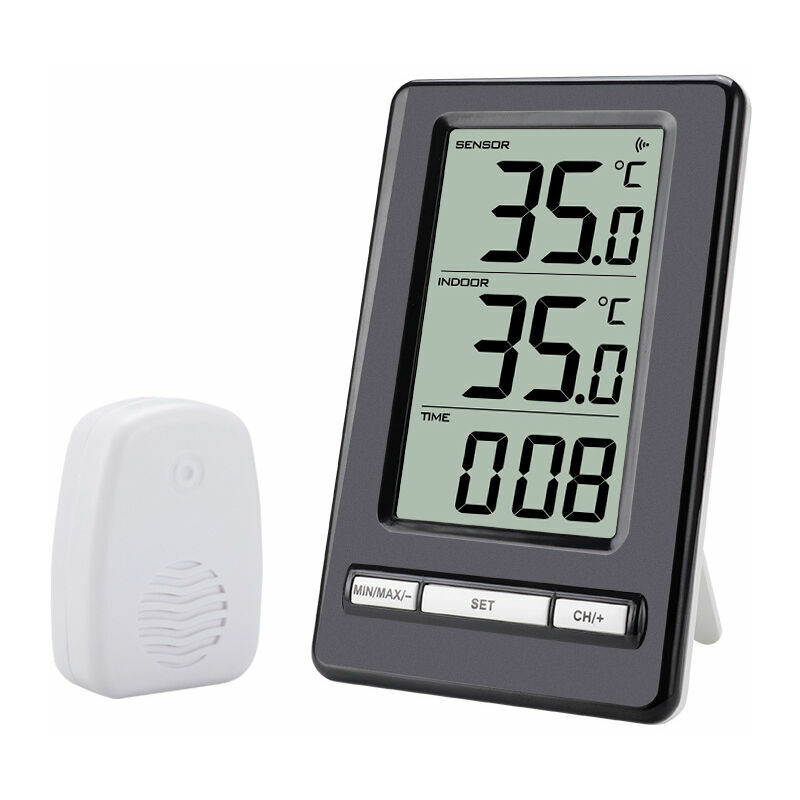 Stazione di temperatura wireless con Black Time Monitora le temperature interne ed esterne in modalità wireless Registrazione di valori di temperatura alta/bassa F/C regolabile Dimensioni: unità principale: 12*7,5*1,5 cm, unità secondaria: 6,5*5*2 cm Colore: nero Quantità: 1 pezzo Si consiglia di installare il sensore in una zona ombreggiata su una parete esposta a nord. La luce solare diretta e le fonti di calore radiante possono causare letture imprecise della temperatura. Il sensore non è impermeabile ed è consigliabile installarlo in un luogo ben protetto. Usa viti o chiodi (non inclusi) per fissare il sensore alla parete.