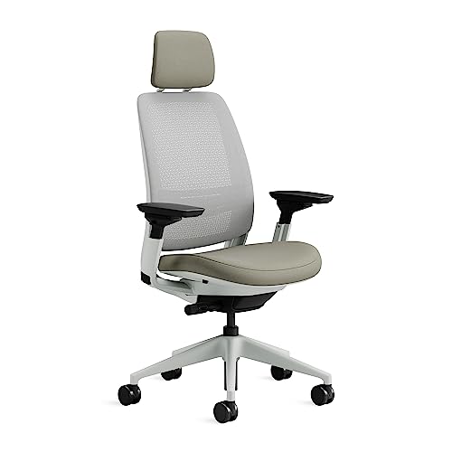 Steelcase Series 2 Sedia da ufficio ergonomica regolabile in altezza, supporto lombare e braccioli regolabili, rete posteriore traspirante grigio chiaro e tessuto del sedile beige/grigio + poggiatesta