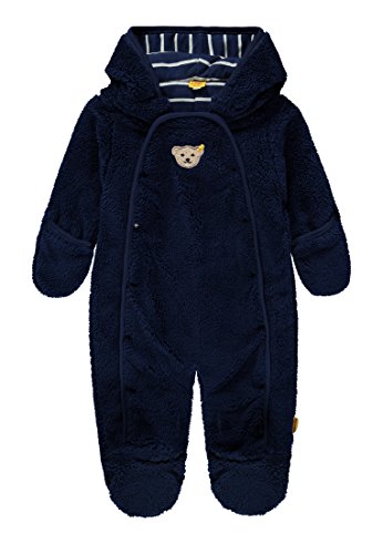La morbida tuta Steiff è foderata in morbido jersey e riscalda in modo sicuro dalla testa ai piedi. Il grande cappuccio è leggermente arricciato nella parte anteriore e si adatta perfettamente alla testa. I polsini pieghevoli sulle maniche proteggono ulteriormente le delicate mani del bambino. Grazie alla cerniera di sicurezza fino al centro della gamba sinistra è facile da indossare. La fibbia vintage a forma di orsacchiotto è una bella attrazione. Un morbido orsacchiotto Steiff sorridente allegramente dal lato sinistro del petto.