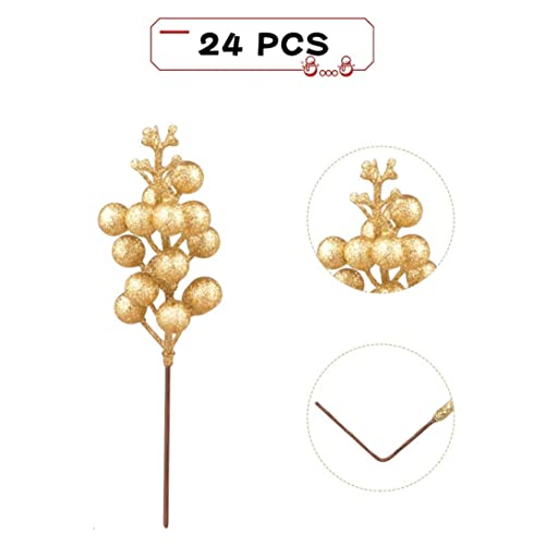 Steli di bacche dorate glitterate, 24 pezzi, plettri di bacche dorate glitterate artificiali Agrifoglio Bacche rosse rami Stelo di bacche di Natale Ornamenti di riempimento per albero di Natale