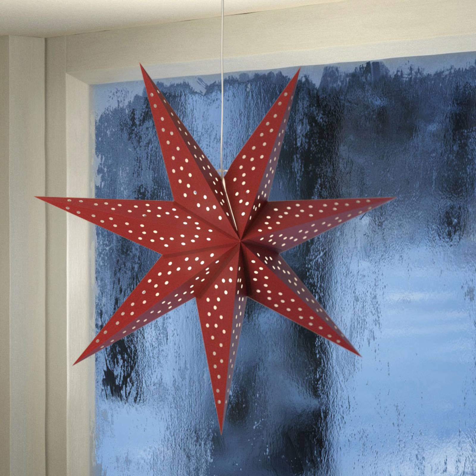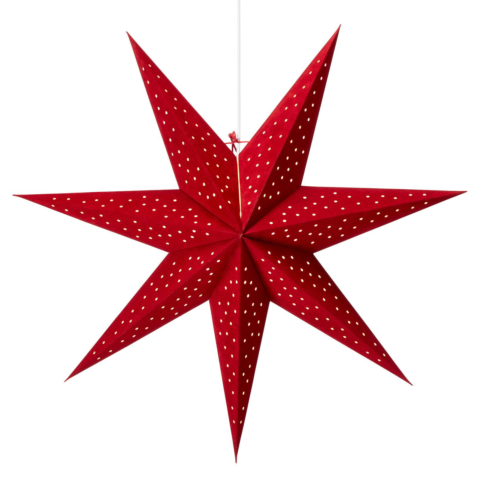Stella decorativa di carta Clara da appendere, aspetto velluto - 7 punteQuesta grande stella diventa un assoluto richiamo visivo in qualsiasi luogo della casa e non solo nel periodo natalizio. La stella di carta, dotata di un motivo a fori, è ideale come decorazione per le finestre, ma è anche molto accattivante in qualsiasi altro luogo, soprattutto quando l'illuminazione è accesa e mette la stella perfettamente in scena.- Dotata di interruttore sul cavo