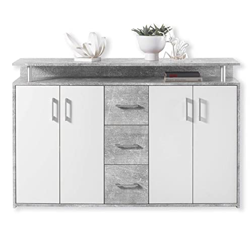 Prodotto 1: TEMPESTIVO - Grazie al semplice design bianco, la credenza può essere integrata in quasi tutti gli stili di interni. Il ripiano superiore e i tre cassetti in ottica cemento completano armoniosamente il quadro generale.