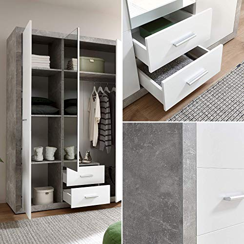 Stella Trading Stone, Elegante Molto Spazio e Anta a Specchio, Versatile Armadio con Ante girevoli, Effetto Cemento e Bianco, Legno ingegnerizzato, 152 x 198 x 55 cm