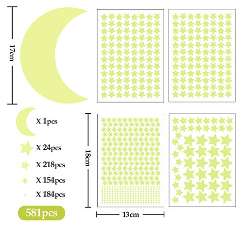 Stelle Fluorescenti Adesive Soffitto, 581 pezzi Stelline Luminose per Cameretta, Adesivi da Parete Fluorescenti, Luna Autoadesivo Luminoso Decorazione