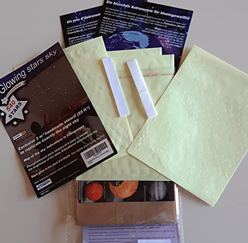 540 Stelle Fluorescenti + 2 Lune + STENCIL ESATTO di Cielo di 2 m2 + Mappe Stellari con indicazioni + Dimensione comparativa di stelle e buchi neri. Fosforescente per 2 soffitti o pareti