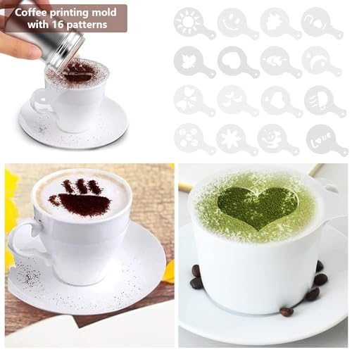 Stencil Cappuccino Modello Barista Shaker Cacao Shaker Cioccolato in Acciaio Inox Stencil Latte Art per glassatura di Biscotti al Caffè, Torta, Decorazione Cupcake con 16 Coperchi a Motivo diverso