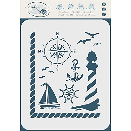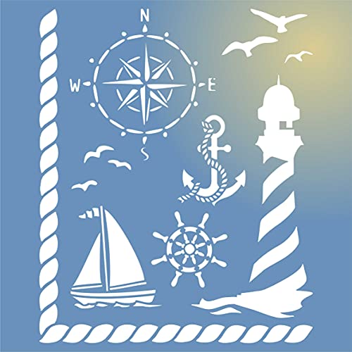 Stencil per pittura nautica, 16,5 x 19 cm (M) - Ocean Seashore Lighthouse Compass Lifebuoy Ships Wheel Stencil per pittura