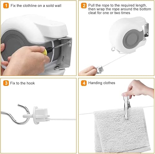 Dotato di Doppio Filo: Ogni linea è di 13 metri. Totalmente 26 metri di spazio di asciugatura massimo. La linea di vestiti retrattile progettata in modo intelligente è perfetta per giardini e balconi più piccoli.