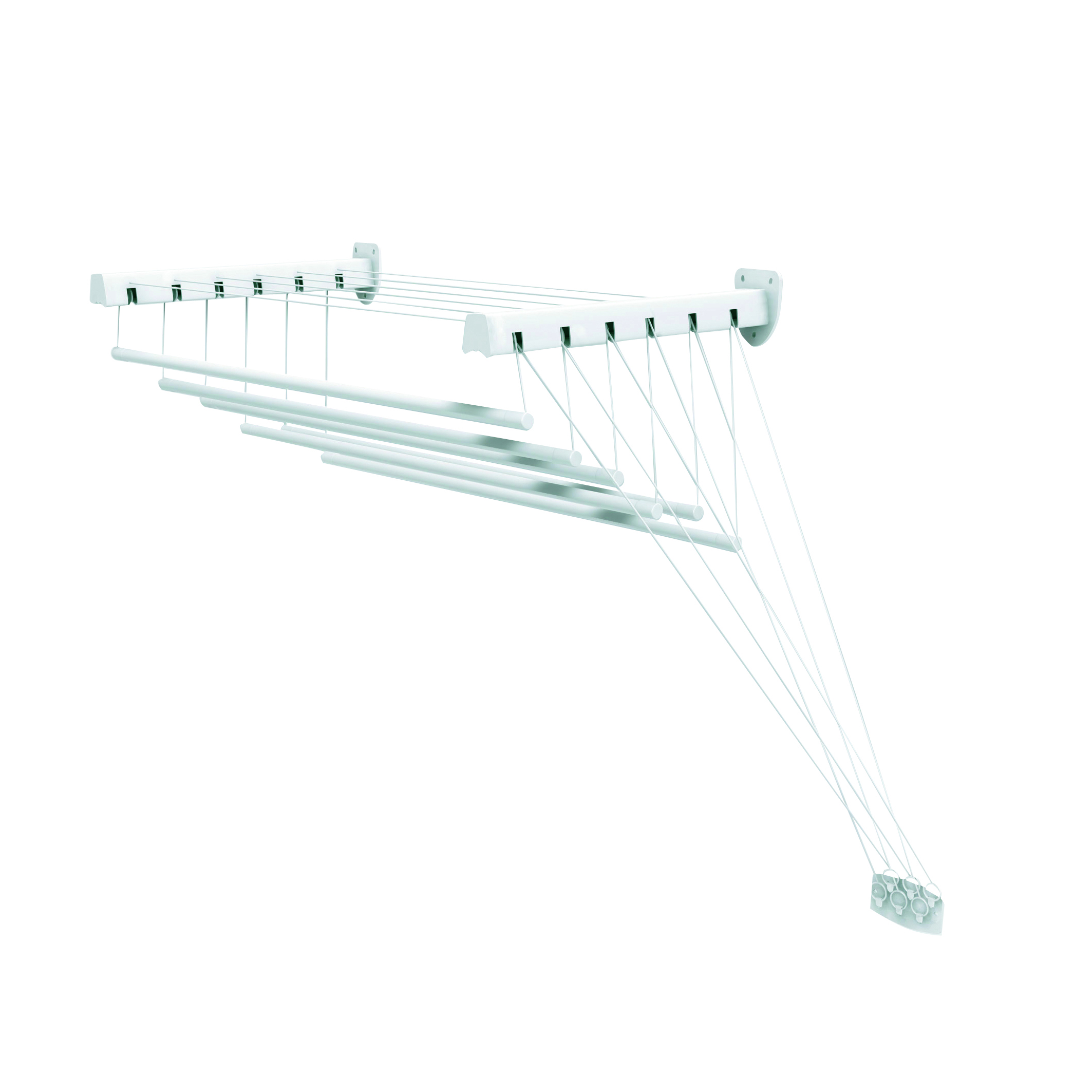 In acciaio verniciato bianco, L 120 x H 135 x P 43 cm, stenditura 7 m. Saliscendi, da fissaggio a soffitto o parete