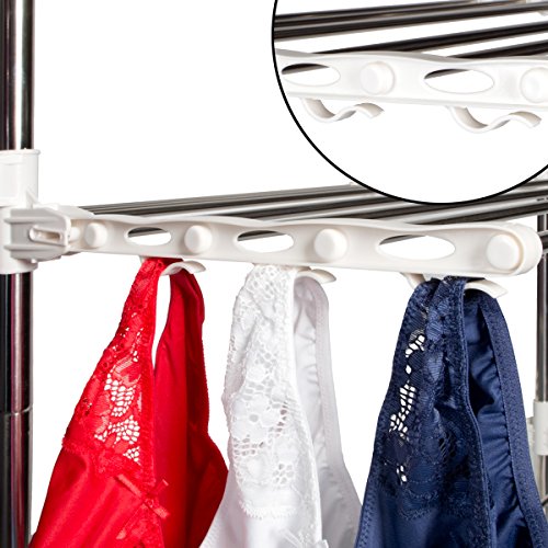 2 aste telescopiche estensibili a sinistra e a destra (ciascuna di 40 cm) per pezzi di biancheria particolarmente grandi (ad es.piumini), 36 porta clip integrati per calzini e biancheria intima e 2 supporti girevoli per 12 camicie.