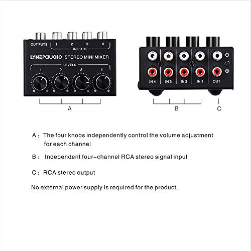 Il mini mixer stereo passivo è un mixer passivo stereo quattro vie per un controllo extra, mixing strumento, lettore CD, tape player, computer, cellulare, tablet e così via.