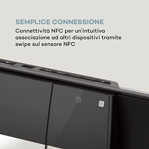 COLLEGAMENTO SENZA FILI: lo stereo cd casa non solo offre la possibilità di collegare dispositivi Bluetooth, ma è anche dotato di nuovissima tecnologia NFC per la connessione intuitiva a breve distanza dal sensore NFC.