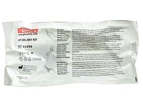 Kit sterile che include uno speculum nasale, un abbassalingua e due speculum auricolari (uno da adulti Ø 4 mm e uno pediatrico Ø 2.5) in plastica., Ogni kit è confezionato in busta singola.