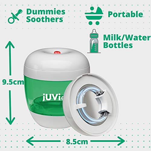 - Dimensioni da viaggio - Il design compatto ed elegante rende il jUViegg il prodotto ideale da tenere nella borsa del bambino consentendo di sanificare sia le tettarelle che i succhietti quando e dove necessario.