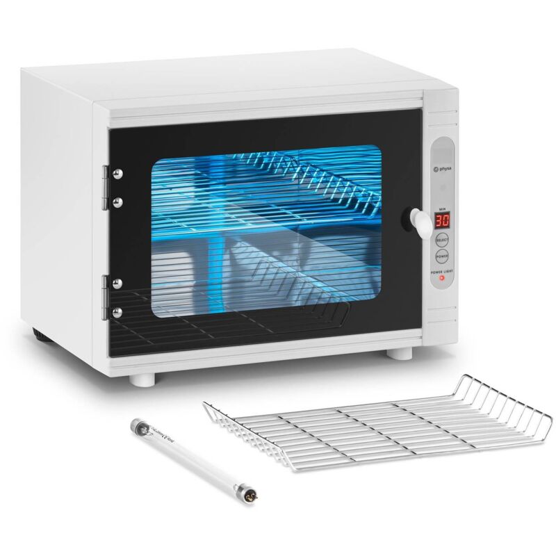 Sterilizzatore UV professionale PHY-6UVS-1 di physa L'utilizzo di questo sterilizzatore UV è estremamente semplice ed efficace. Posiziona tutti gli oggetti che vuoi disinfettare nel dispositivo. Grazie al suo volume di 10 litri è possibile anche utilizzarlo per più dispositivi. Attiva la luce UV impostando il timer su una durata di 8 - 30 minuti. Il display LED ti permette di controllare la durata del processo. Gli utensili vengono irradiati con un'onda lunga 235 nm. Grazie alle superfici laterali riflettenti e alla base brillante, tutti gli oggetti all'interno del dispositivo vengono colpiti dai raggi UV. La luce UV ha un effetto sterilizzante che uccide tutti i batteri, i germi e gli agenti patogeni sulla superficie dello strumento. L'uso di questo sterilizzatore non è solo più facile rispetto al detergente o al calore ma è anche più delicato. Anche oggetti più sensibili come i touch screen possono essere sterilizzati in modo affidabile. Dato che non hai bisogno di alcuna sostanza