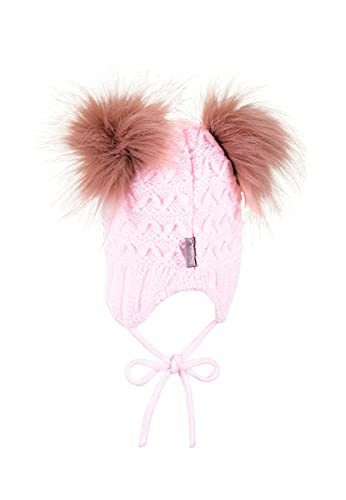 Berretto lavorato a maglia, paraorecchie lavorato a maglia, due pompon in finta pelle e laccetti, foderato con jersey di cotone felpato.