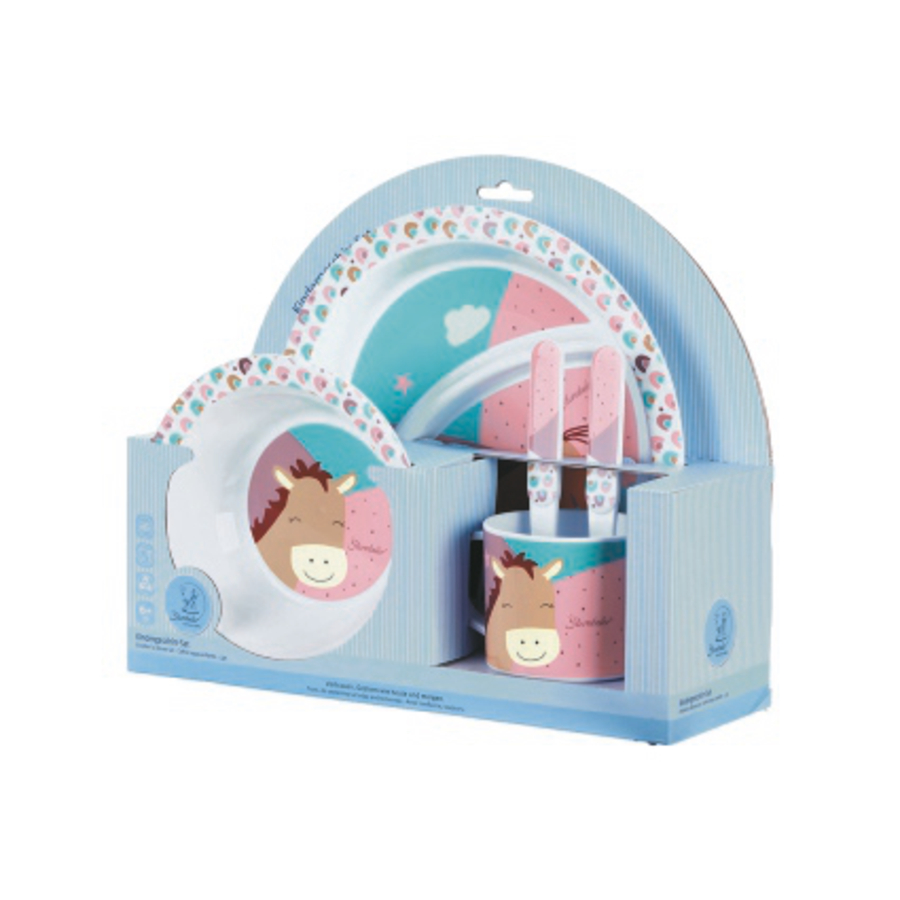 Con il set di stoviglie per bambini Sterntaler, anche i più piccoli possono ora imparare a mangiare come i loro genitori. Il set di stoviglie è composto da un piatto da menu, una ciotola, posate e una tazza con manico. Il motivo popolare con il pony Pauline delizierà il vostro bambino. Questo rende ancora più divertente imparare a mangiare! Le stoviglie sono anche lavabili in lavastoviglie e possono quindi essere facilmente pulite. Il set di piatti è adatto a partire da 6 mesi. dettagli del prodotto: misure: Dimensioni cucchiaio: 14,5 cm Dimensioni forcella: 13,9 cm Dimensioni tazza: 7,6 cm Dimensioni piastra menu: 21,8 cm Dimensioni ciotola: 14,2 cm Materiale: 100 % polipropilene contenuto: cucchiaio, forchetta, tazza, piatto del menu, ciotola Pulizia: Lavabile in lavastoviglie Cibo sicuro Età: a partire da 6 mesi Attenzione Non adatto al microonde.