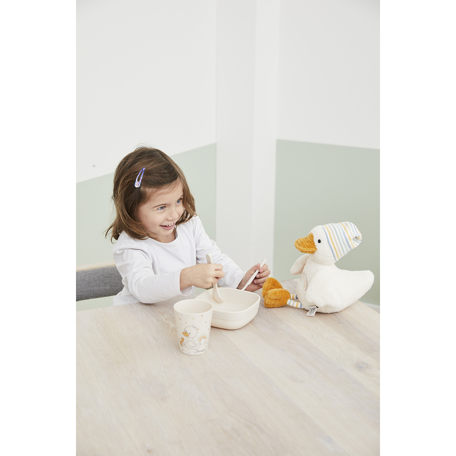 Dettagli del prodotto: Età: da 12 mesi Set di stoviglie quadrato con tazza, piatto, ciotola e posate, con stampa giocosa del motivo di Edda la papera Dimensioni e peso: Dimensioni assemblate (lunghezza x larghezza x altezza): 23,5 x 25 x 10 cm Materiale e cura: Materiale: 100% polipropilene Istruzioni per la cura: adatto per alimenti, lavabile in lavastoviglie, non adatto per il microonde