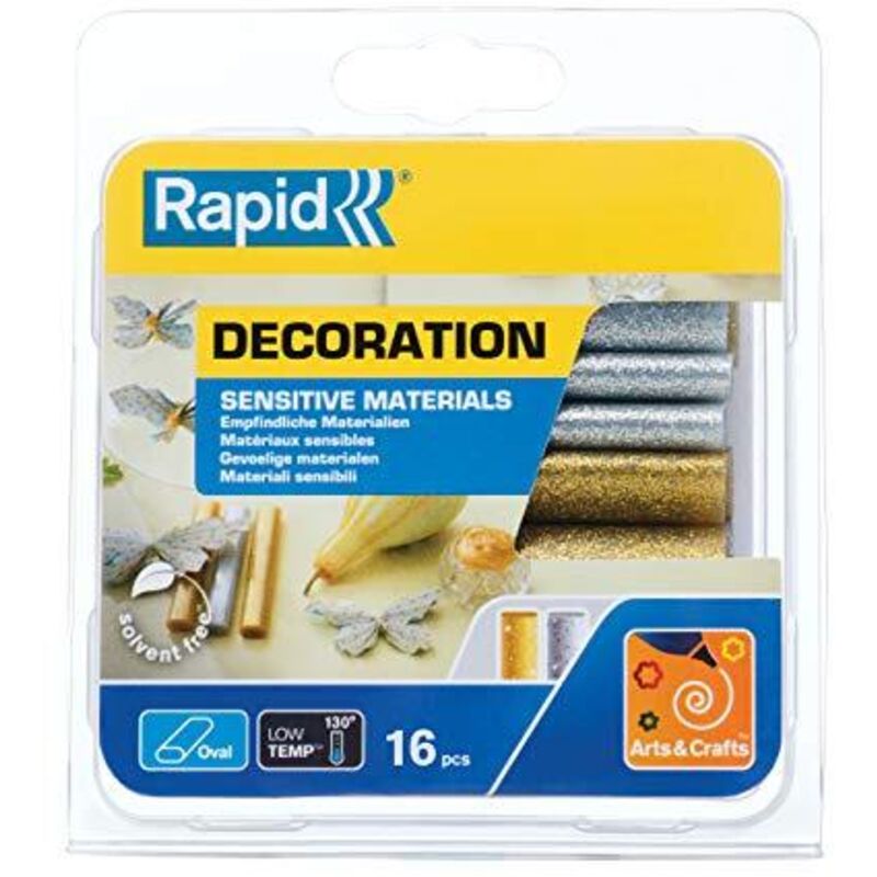 Stick di Colla colorata a bassa temperatura Rapid, Per materiali sensibili al calore, Ideale per le decorazioni Un simbolo colorato indica chiaramente su quali incollatrici si può usare, Compatibile con l'incollatrice Rapid EG130 Lunghezza 94mm, Sezione ovale, Possibilità di rimuovere la colla con un soffiatore ad aria calda La colla è un isolante elettrico, Non tossica, Inodore, Resistente e a lunga durata, colori: Oro/Argento Glitter Contenuto: 1 Confezione di Stick di Colla Rapid ovali, Lunghezza 94mm, 40108463, Dimensioni (LxAxP): 135x118x19mm, Peso: 125g