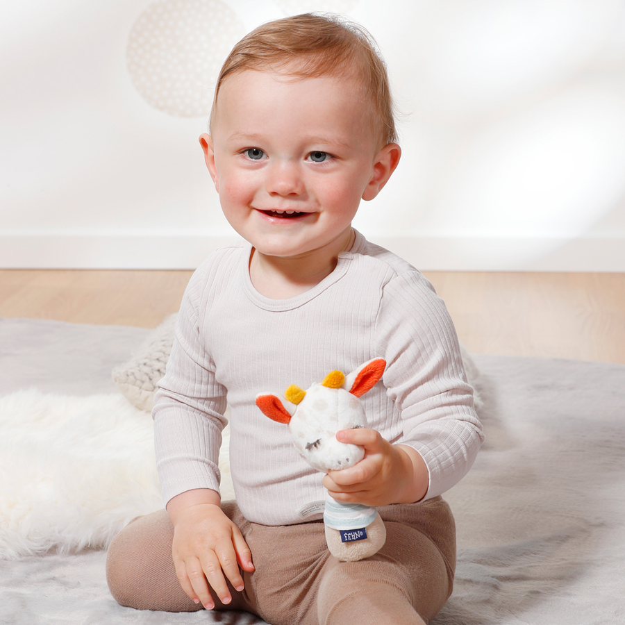 La piccola giraffa sonaglio della Good Night Collection può essere portata ovunque e accompagna il bambino mentre gioca e sogna nel lettino, nel seggiolino auto o nella carrozzina. Gli elementi fosforescenti sulla giraffa tolgono al bambino la paura del buio la sera e trasmettono un senso di sicurezza. Durante il giorno, la giraffa coccolosa stimola giocosamente i sensi del bambino. Con morbidi suoni sferraglianti, incoraggia ad afferrare, toccare, scoprire e giocare. Perfetto per casa e in viaggio. Dettagli del prodotto: Dimensioni (lunghezza): circa 14 cm Istruzioni per la cura: lavabile a 30 °C Materiale: velour, jersey Imbottitura: 100% poliestere Età: da 0 mesi
