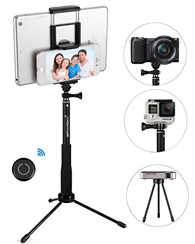 Stick Selfie, GRANDO Clip 2 in 1 Monopiede Nero Estensibile Con Telecomando Bluetooth e Treppiede Per Tablet, Apple, Android e Fotocamere