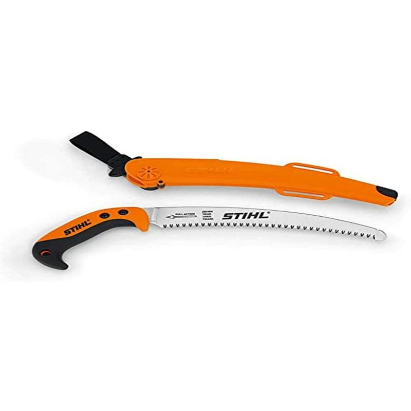 Sega per potatura Stihl con lama curva. Sega per potatura con lama curva in acciaio cromato temprato a impulsi. Forma della lama conica, impugnatura ergonomica a 2 componenti per segare i rami in modo molto veloce ed estremamente preciso. Fondina per montaggio su entrambi i lati. Adatto sia per mancini che per destrimani. Disponibile a scelta con lama da 33 cm per rami con diametro fino a 150 mm o con lama da 27 cm per rami con diametro fino a 120 mm.
