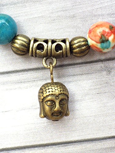 Stile tibetano braccialetto vintage perle di giada bianca tinto marrone, arancione e blu, perline metalliche e charms a forma di Buddha testa bronzo antico
