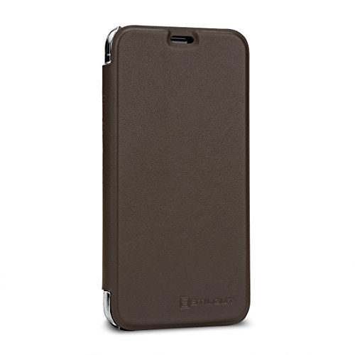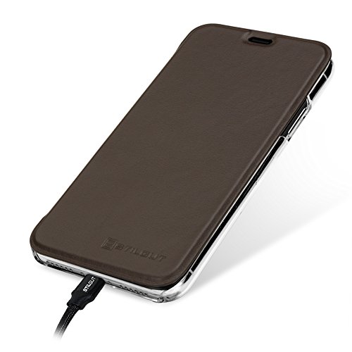 StilGut custodia compatibile con iPhone X con NFC/RFID Blocker in plastica trasparente con patta in pelle nappa. Marrone/trasparente