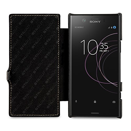 StilGut Book Type Case, Custodia a Libro Booklet Custodia Orizzontale, Cover Apertura Laterale in Vera Pelle per Sony Xperia XZ1 Compact, Nero con Clip