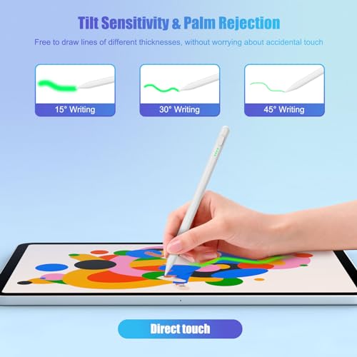 Rilevamento dell'Inclinazione e Inibizione del Palmo - Il rilevamento dell'inclinazione traccia linee spesse e sottili sullo schermo in base all'angolazione dello stilo per iPad, offrendo maggiore libertà di scrittura e disegno. Lo stilo è dotato di inibizione del palmo della mano, in modo da poter tenere la mano sullo schermo senza preoccuparsi di tocchi accidentali. Perfetto per disegnare o scrivere su iPad.
