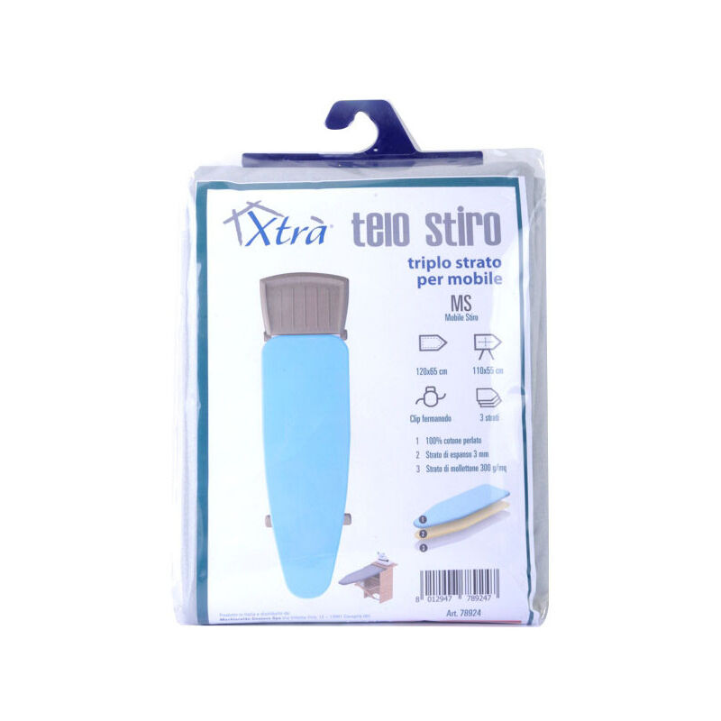 Cotone perlato Triplo strato Mollettone g/mq 300 Strato espanso spessore mm 3 Corda e clip fermanodo Adatto per mobili stiro cm 110x55