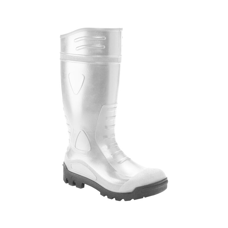 Stivale antinfortunistico Bianco, misura ginocchio, in mescola speciale di P.V.C. Stivale antinfortunistico, misura ginocchio, in mescola speciale di P.V.C. Resistente ad olii, benzina e grassi. Suola antistatica e antiscivolo, puntale in acciaio (S4). Ottima flessibilità anche alle basse temperature. CE EN ISO 20345:2004 S4